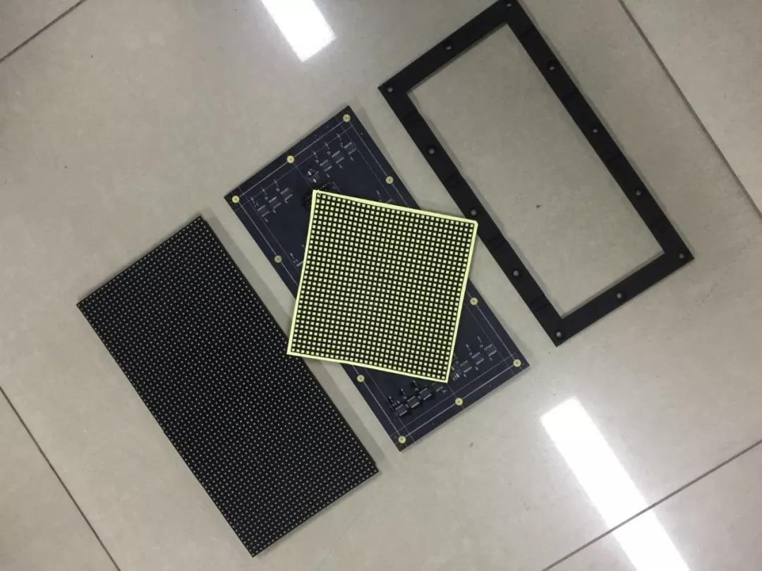 这是P4软模组的实拍分解图,,,有FPC材质的柔性线路板、、、软面罩、、、、0.8cm厚度的软底壳以及贴好了灯的灯板。。。